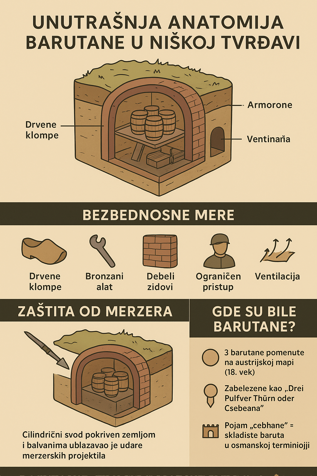 U senama niških bastiona, tamo gde se kameni zidovi uvijaju kao senoviti rukavci vremena, nalaze se barutane — skromne komore koje su vekovima čuvale najopasniju, ali i najdragoceniju supstancu ratova: barut. Njihova prisutnost u tvrđavi nije bila samo tehnički zahtev; ona je određivala ritam vojnih strategija, arhitektonski raspored celog utvrđenja i ravnotežu između moći i katastrofe. U njima se, u najmračnijem kutku tvrđavskog tela, čuvala sila sposobna da odbrani grad, ali i da ga uništi za jedan jedini trenutak neopreza.
