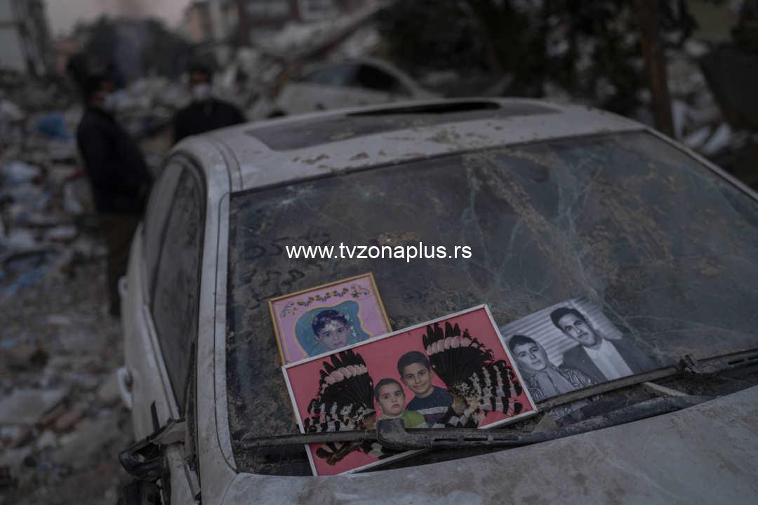 Pictures recovered from the rubble of a building destroyed during the earthquake are placed in a windshield of a car in Antakya, southeastern Turkey, Sunday, Feb. 12, 2023. Turkish justice officials are targeting contractors allegedly involved in shoddy and illegal construction after a pair of earthquakes on Feb. 6 collapsed thousands of buildings in southeast Turkey and northern Syria. (AP Photo/Bernat Armangue)