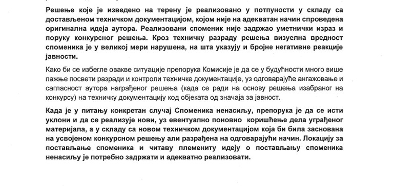 KOMISIJA ODLUČILA: SPOMENIK NENASILJU BIĆE UKLONJEN ZBOG PROPUSTA