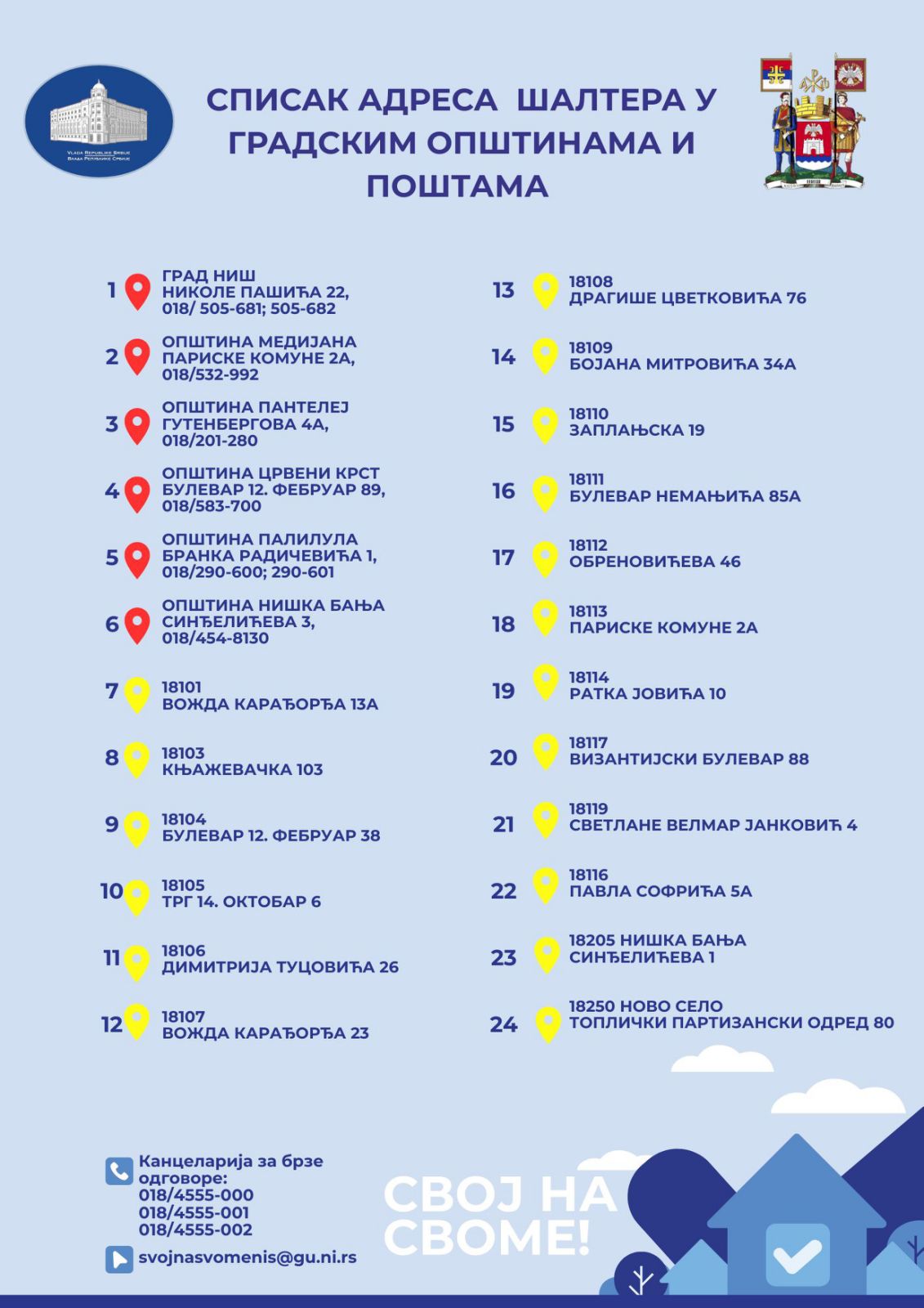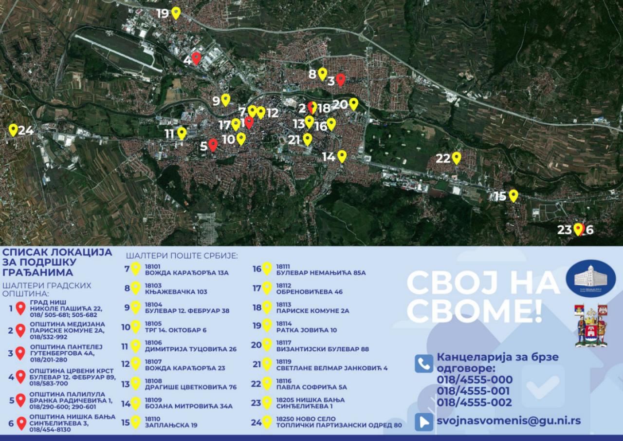 Od 8. decembra građani Niša moći će da započnu postupak upisa svojine po zakonu „Svoj na svome“ na više od 20 lokacija širom grada. Kako je izjavio većnik Ivan Grmuša, šalterska mesta biće otvorena u svim gradskim opštinama, na adresi Nikole Pašića 22, kao i u svim poslovnicama Pošte.