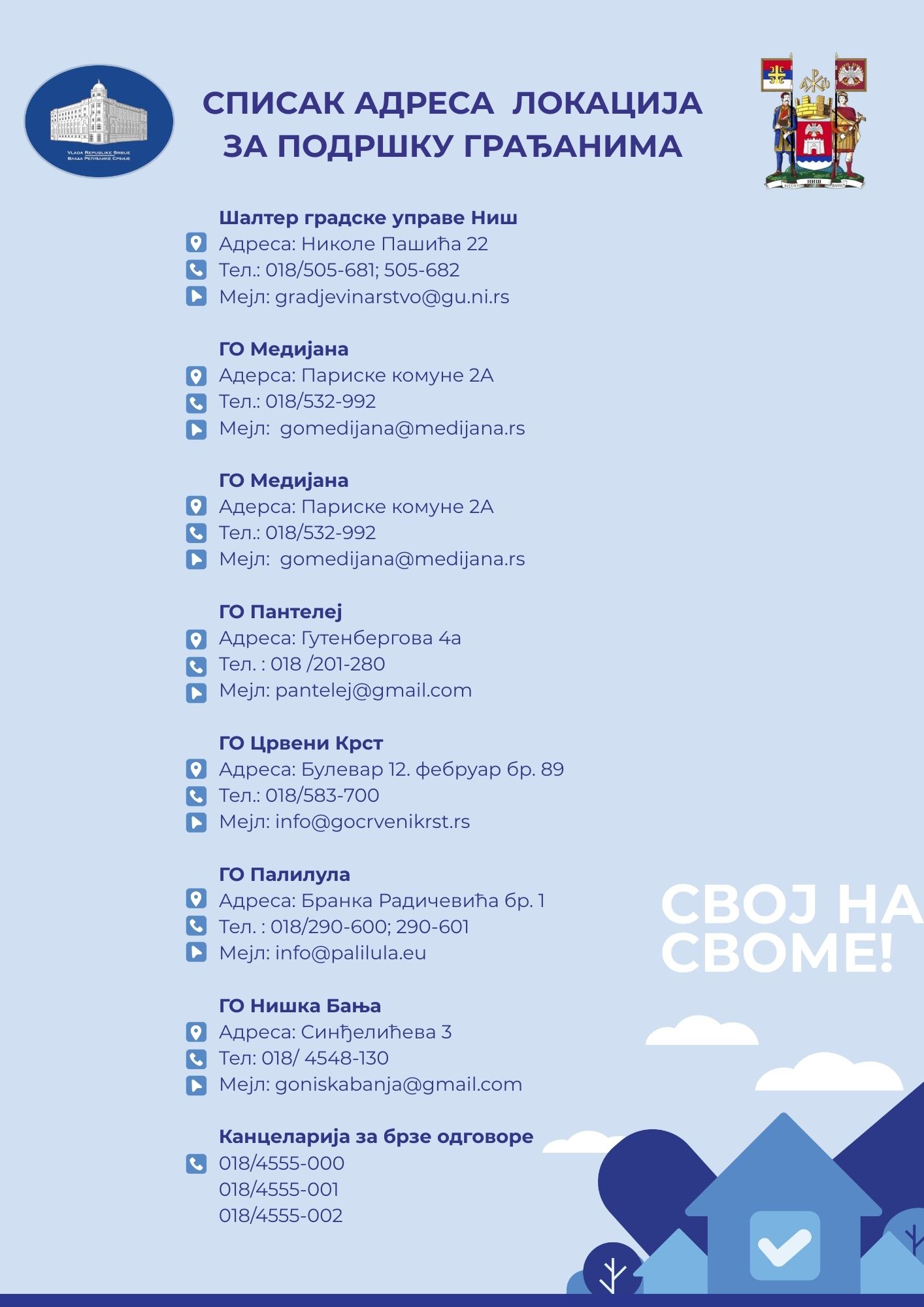 „Osmog decembra otvaraju se šalteri na teritoriji Niša i kreće se s asprovođenjem Zakona Svoj na svome. Grad Niš zajedno sa Vladom Republike Srbije i Ministarstvom građevine, saobraćaja i infrastrukture obezbedio je 24 lokacije na teritoriji grada. Jedna od njih je u Ulici Nikole Pašića 22, kao i u svim gradskim opštinama  i pored toga na svim šalterima pošte na teritoriji Grada Niša. Ono što je važno je da sugrađani sa sobom ponesu ličnu kartu, fotografije objekta, dokaz o pravu svojine nad objektom ili zemljištem i samim tim ostvare  svoje pravo za upis svojine“, izjavio je  većnik Grada Niša Ivan Grmuša.