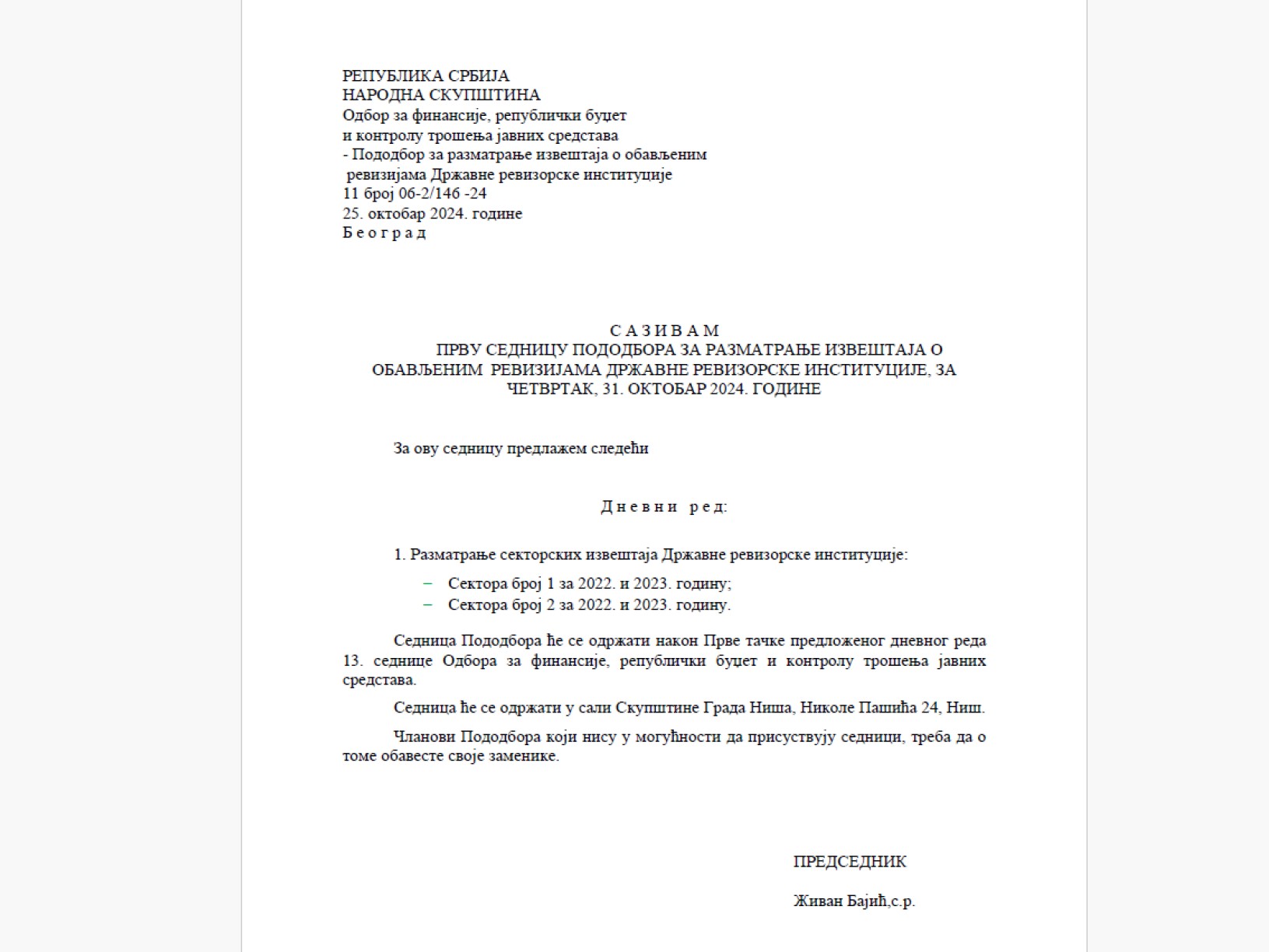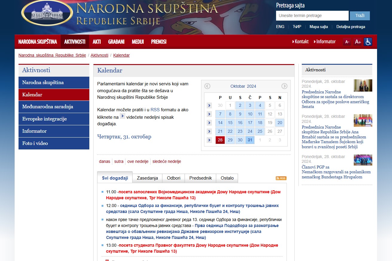 Odbor za finasije zakazan je u Nišu u četvrtak 31.10. u kalendaru Republičkog parlamenta .
