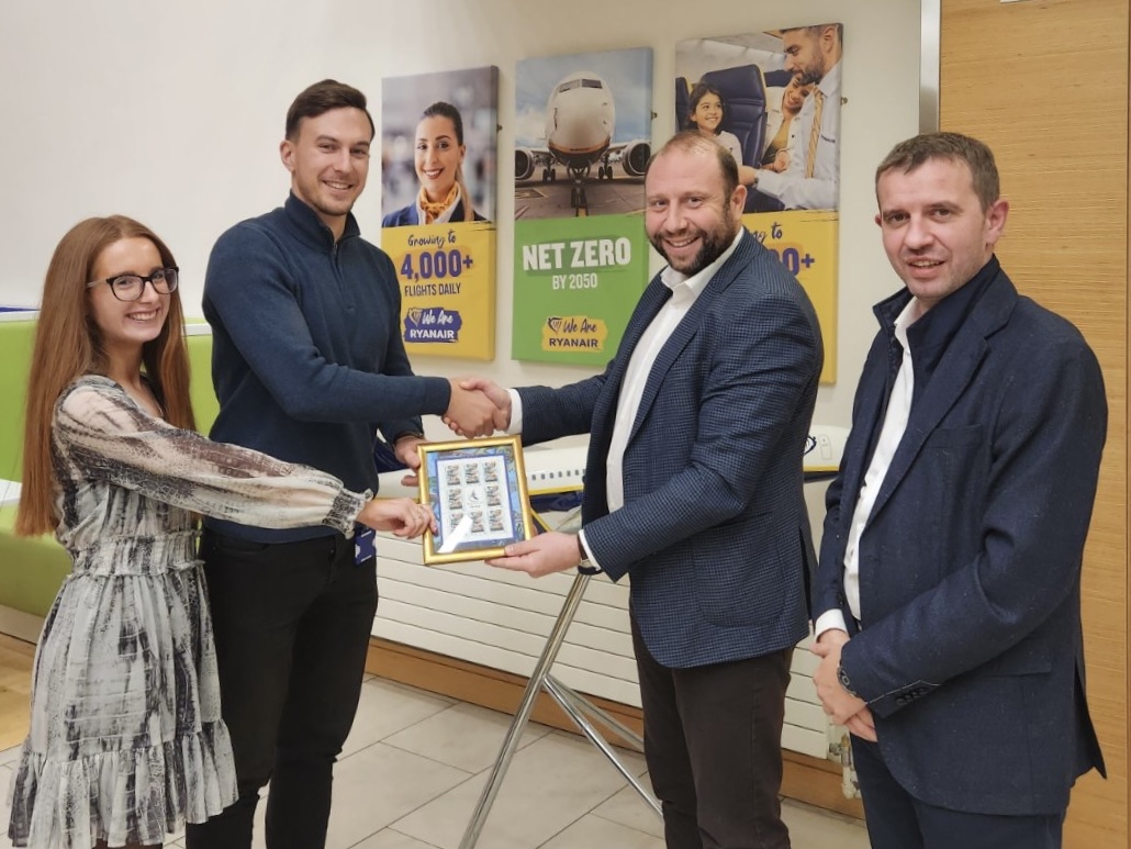 Sedište kompanije Rajaner će nakon ovog sastanka krasiti i zanimljiv poklon koji je stigao iz Niša. Naša delegacija je rukovodstvu irske avio-kompanije uručila specijalnu ediciju personalizovane poštanske marke koja je štampana povodom otvaranja nove zgrade niškog aerodroma sa porukom “Novi simbol Niša!”.
